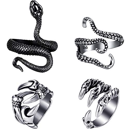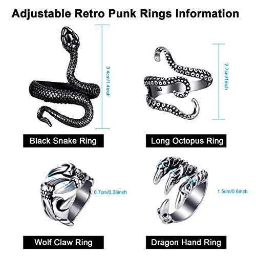 4 Piezas anillo vintage punk anillo de acero inoxidable ajustable pulpo dragón