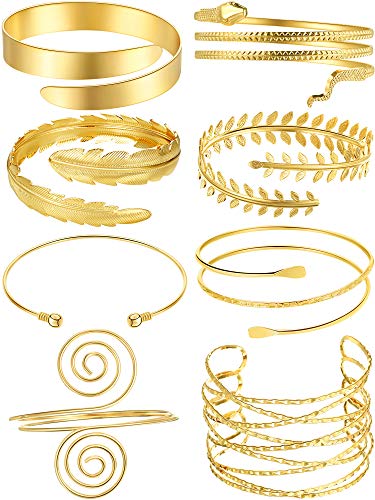 Varios estilos: hay 8 piezas de brazaletes minimalistas en la parte superior del brazo en diferentes estilos, brazalete de hoja, brazalete de pluma, brazalete de banda ancha, brazalete de goth y brazalete de serpiente, etc., puede usarlo solo o apilarlo según sus propias preferencias
