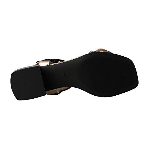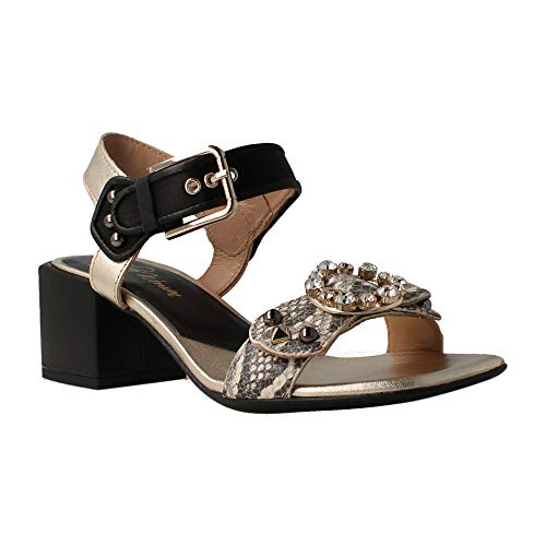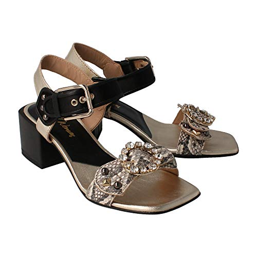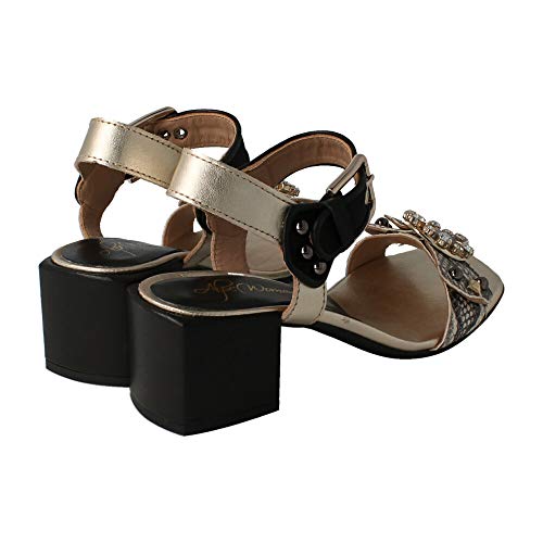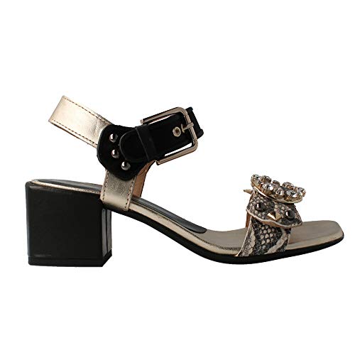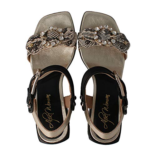 Sandalia Alpe de piel combinada negra y dorada. La tira frontal es con diseño de serpiente y piedras frontal sobre la misma. El cierre es de hebilal, el tacón de 6 cm y la suela de goma. Un diseño elegante a la par que cómodo.