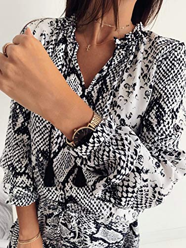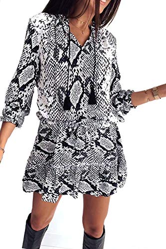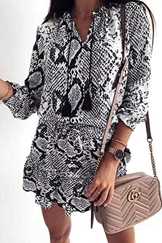 Este vestido con estampado de serpiente es de gran tamaño y ajuste relajado, junto con un elegante cuello alto con cuello en V, mangas cortas y una cómoda longitud midi.