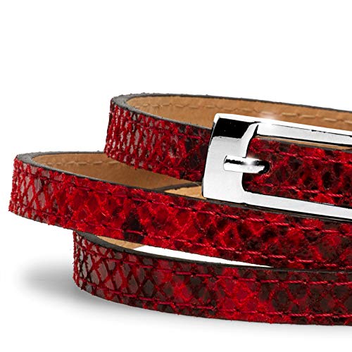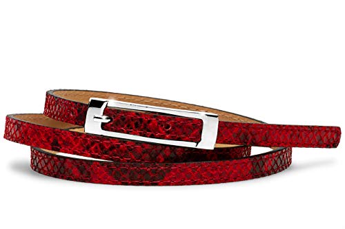 Cinturón elegante y estrecho hecho de piel natural, con hebilla metálica de color plata y un estampado de piel de serpiente. Un cinturón de cadera perfecto para una aparencia glamorosa. El cinturón con un ancho de sólo 1 cm es un accesorio ideal para un vestido, una camiseta larga etc., crea una silueta feminina y da un no sé qué a su outfit. El cinturón de alta calidad tiene un diseño atemporal y es un accesorio must-have. Material: Exterior: Cuero Nappa con estampado de piel de serpiente multicolor; Interior: Cuero sintético de alta calidad. CASPAR Fashion Collection – Hecho en Italia. Elegido por Valentin W. [STAR Fashion]