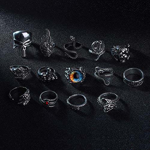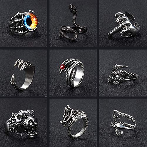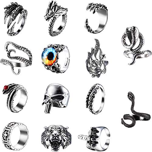 ★14PCS JUEGO DE ANILLOS GÓTICOS★ Hay 14 anillos vintage para hombres en un juego de anillos, obtendrás un anillo de serpiente, un anillo de dragón, un anillo de garras de dragón, un anillo de ojo de gato, un anillo de pulpo y un anillo de plumas, etc. Varios diseños para adaptarse a sus diferentes necesidades de combinación todos los días. Vienen con una bolsa de terciopelo para que guardes tus joyas. Este conjunto de anillos de animales retro puede hacerte lucir genial y masculino