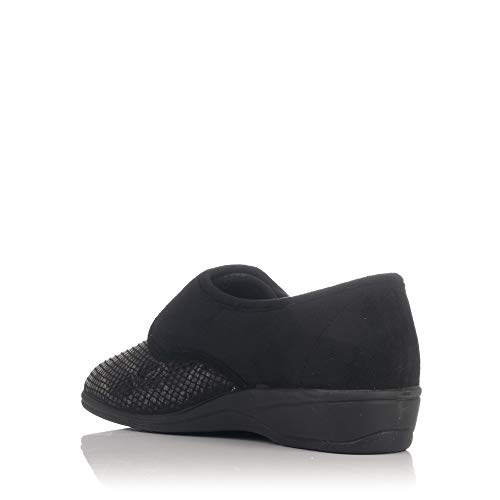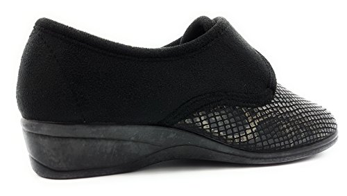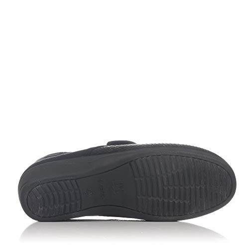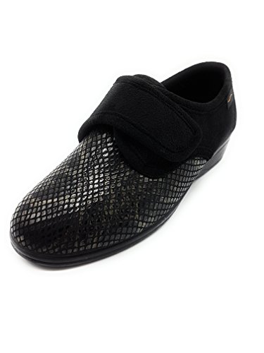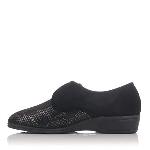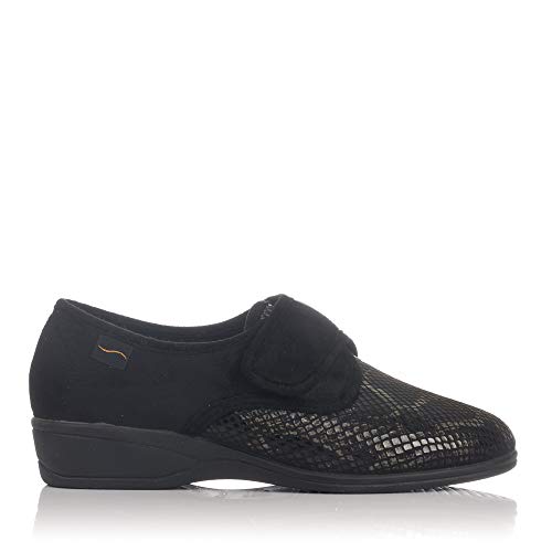 Zapatillas de casa y calle fabricadas en piso de caucho con tejidos de antelina combinado en lycra elástica. Diseño de velcro fácil de poner que permite calzar a los pies más delicados, anchos y sensibles que nos podemos encontrar. Incorpora una plantilla extraíble transpirable para amortiguar la pisada al caminar. Hechas en España.