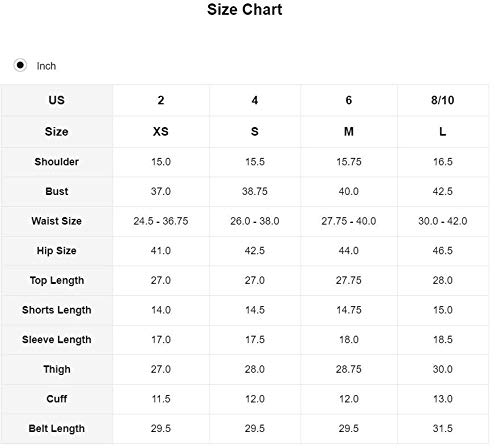 XS: Hombro: 15.0″, Busto: 37.0″, Cintura: 24.40-36.61″, Tamaño de la cadera: 40.9″, Longitud de la parte superior: 26.8″, Longitud de los pantalones cortos: 14.2″, Longitud de la manga: 17.1″, muslo: 27.2″