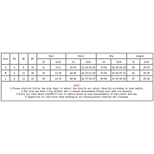 M = US6 = EU38 = UK10 (cm) Busto: 33 / 12.99, cintura: 64-80 / 25.20-31.50, cadera: 76-94 / 29.92 – 37.01, longitud: 66 / 25.98