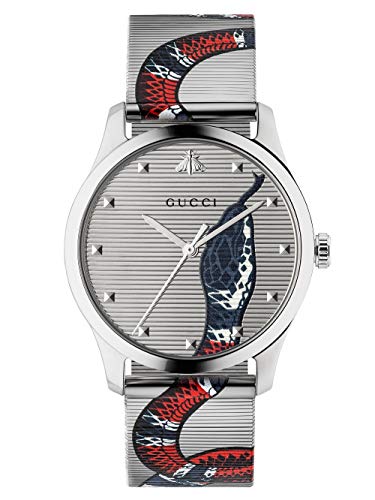 Gucci G-Timeless Ver con la serpiente en la cabeza en el cuadrante YA1264123 Entre los animales que habitan en la imaginación de la Maison,la sinuosidad de la culebra rey está impreso en este reloj G-Timelessy se extiende desde la esfera y la correa de acero. Caja de acero, esfera con motivo de red y la impresión de la cabeza de la serpiente,pulsera de acero con la impresión de que el cuerpo de la serpienteMovimiento de cuarzo ETASumergible hasta 5 ATM (160 pies/50 metros)REF.YA1264123 El paquete incluyeReloj GucciDocumentos y 24 meses de Garantía GucciEmbalaje Original con envoltura original Gucci…