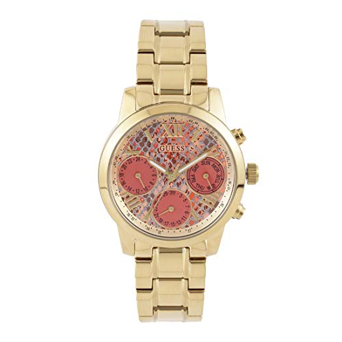 Reloj Guess W0448L7. Este hermoso reloj tiene un diseño único de piel de serpiente en la esfera de la cara con esferas interiores de color naranja. También cuenta con una correa de pulsera dorada. Esta impresionante pieza es realmente única y seguro que te hará notar. Medidas: longitud de la correa: 210 mm, profundidad de la caja: 10 mm, ancho de la caja: 20 mm.