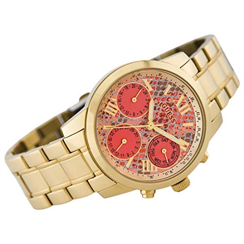 Reloj Guess W0448L7. Este hermoso reloj tiene un diseño único de piel de serpiente en la esfera de la cara con esferas interiores de color naranja. También cuenta con una pulsera de oro. Esta impresionante pieza es realmente única y seguro que te hará notar. Medidas: longitud de la correa: 210 mm, profundidad de la caja: 10 mm, ancho de la caja: 20 mm