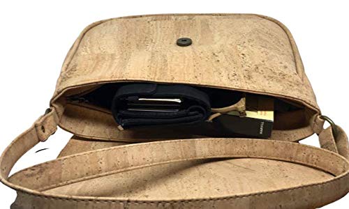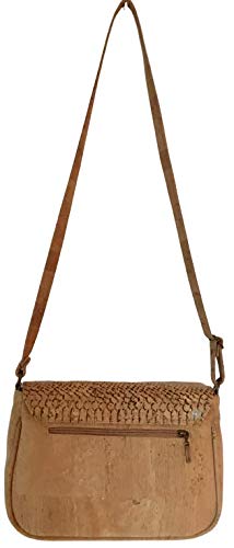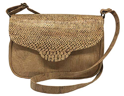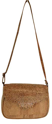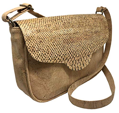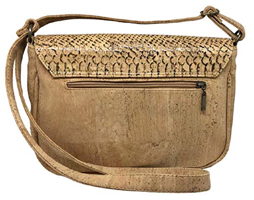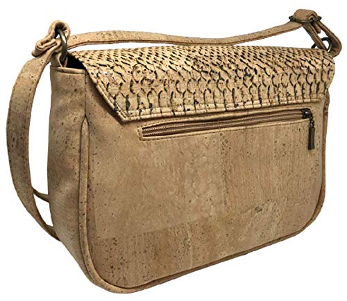 Elegante bolso de corcho natural con solapa estampada. Tamaño grande. Cierre de imán y cremallera. Tiene un pequeño bolsillo interior con cremallera y también uno en la parte posterior del bolso. Correa ajustable.