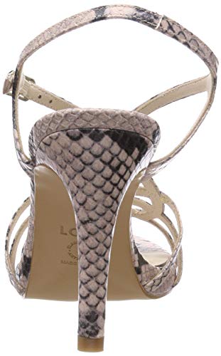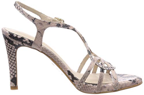 Sandalia de tacón fino de 9 cm en piel grabada con estampado de serpiente en tono nude- tiras cruzadas sobre el empeine. Cierre de hebilla.