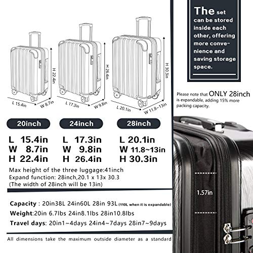 Maleta de 20 pulgadas – L 35 cm x L 20 cm x 50 cm – 5.72lbs, 40L Maleta de 24 pulgadas – L 40cmx L 25cm x H 60cm – 7.5lbs, 60L. Las tres tallas sin expandible.