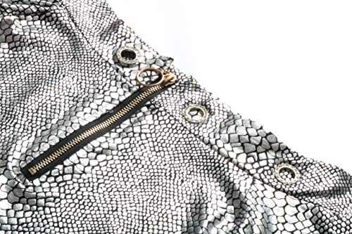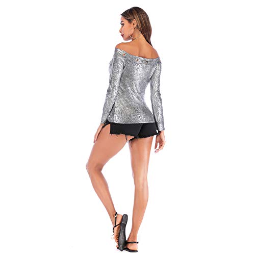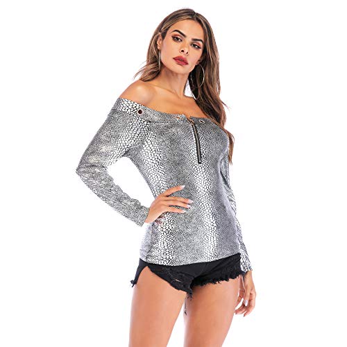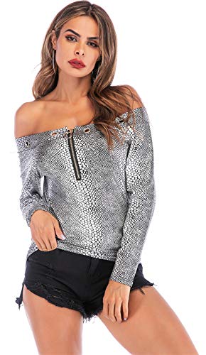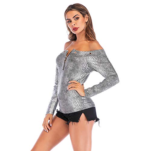 Long Sleeve Slim Fit Off The Shoulder Eyelet Zippered Zipper Front Zip Up Closure Snake Skin Snakeskin Printed Pattern Shiny Metallic Pullover Pull On Blouse Shirt T-Shirt Top Silver.