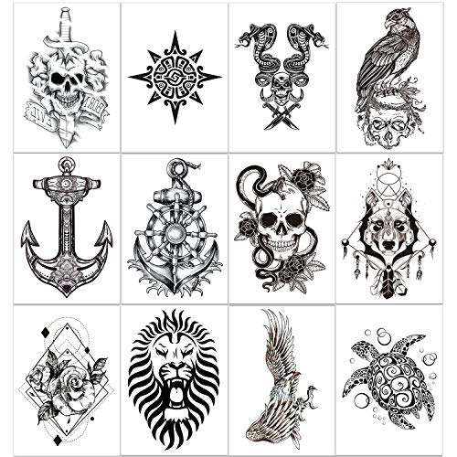 TATUAJES TEMPORALES PARA HOMBRES / MUJERES: Contiene 30 hojas de tatuajes temporales de brazo grande negro para hombres / mujeres / niñas / niños, patrones como calavera / lobo / serpiente mamba / búho / cabeza de toro / tiburón / ciervo / unicornio / remo / flores / estrellas / sol, ¡Tus amigos pensarán que tienes un nuevo tatuaje! Muy divertido para fiestas, ocasiones especiales también para probar cómo se vería un tatuaje real.