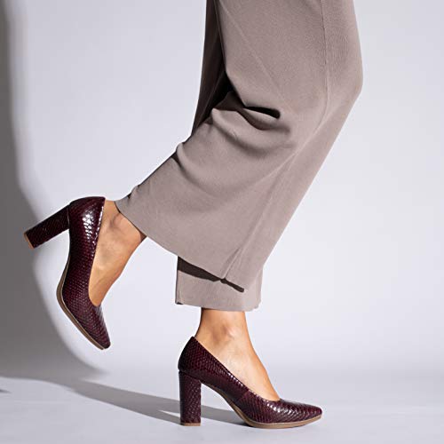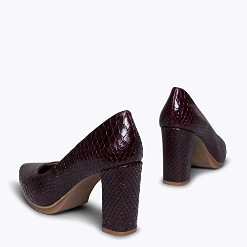 Zapato de piel con tacón alto de 8,5 centímetros. Un zapato estilo salón cómodo gracias a la tecnología del confort de miMaO, nuestra plantilla de piel Gota Ultra Confort Gel.